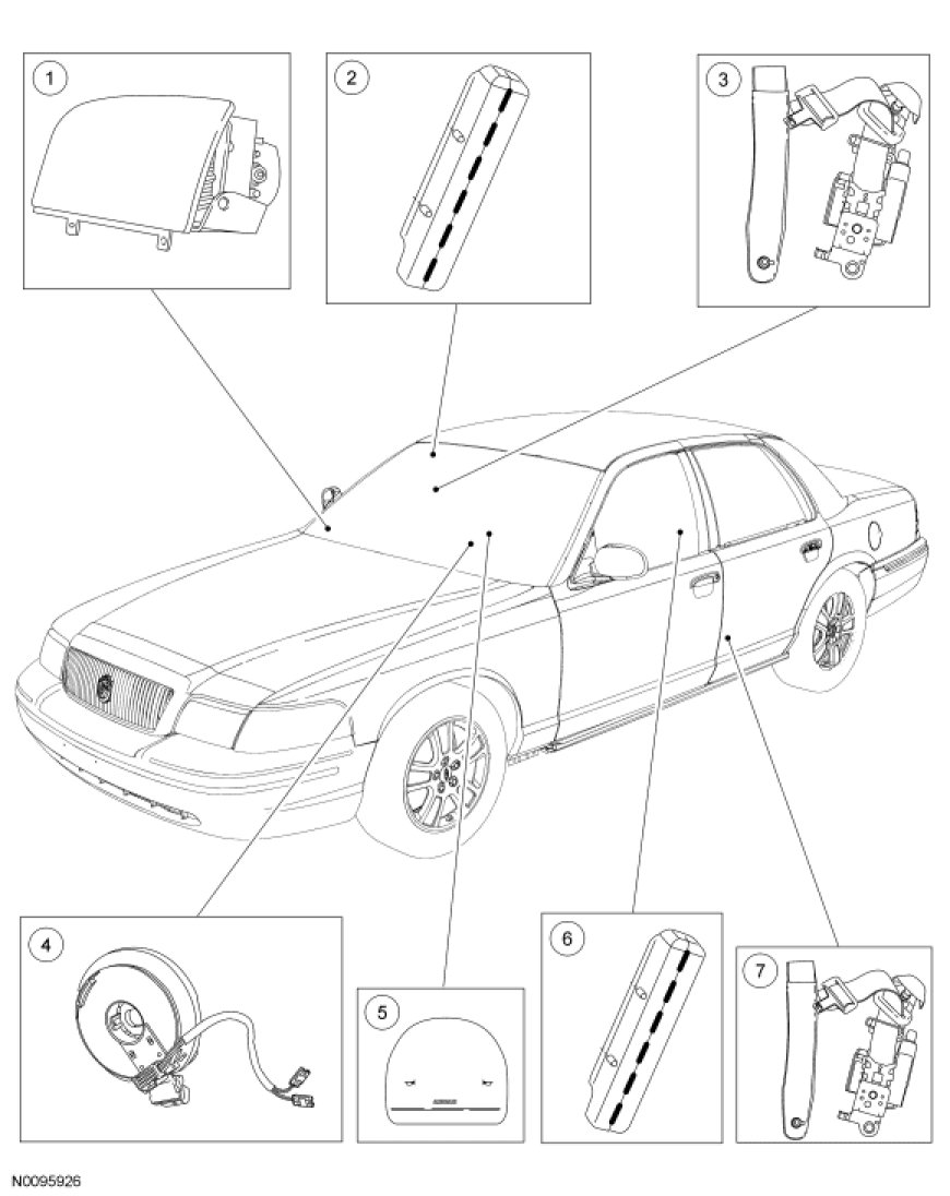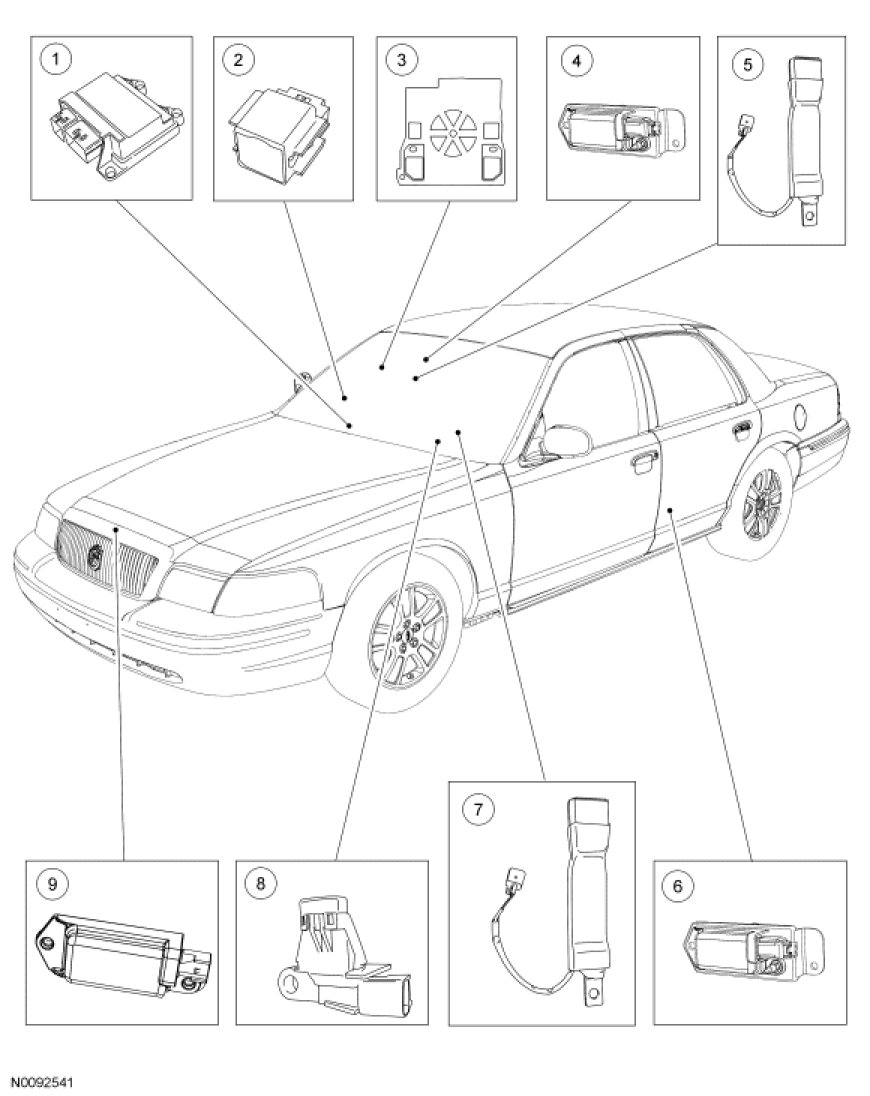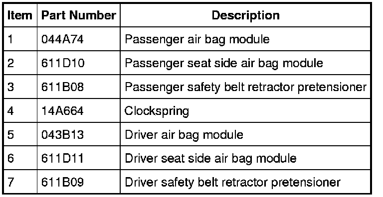 The serviceable air bag and safety belt pretensioner SRS components are shown in the following illustrations.