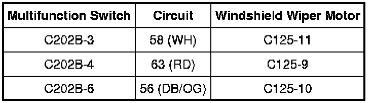 - Measure the resistance at windshield wiper motor C125, harness side, between the circuits shown in the following chart.