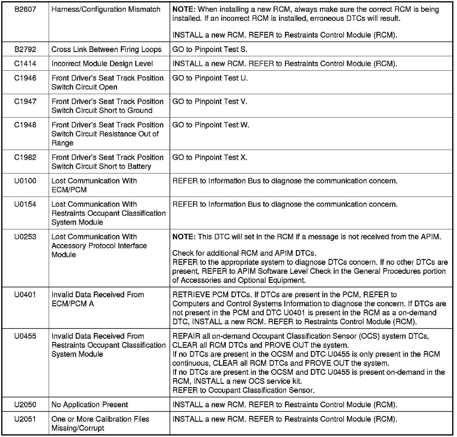 Restraints Control Module (RCM) DTC Chart