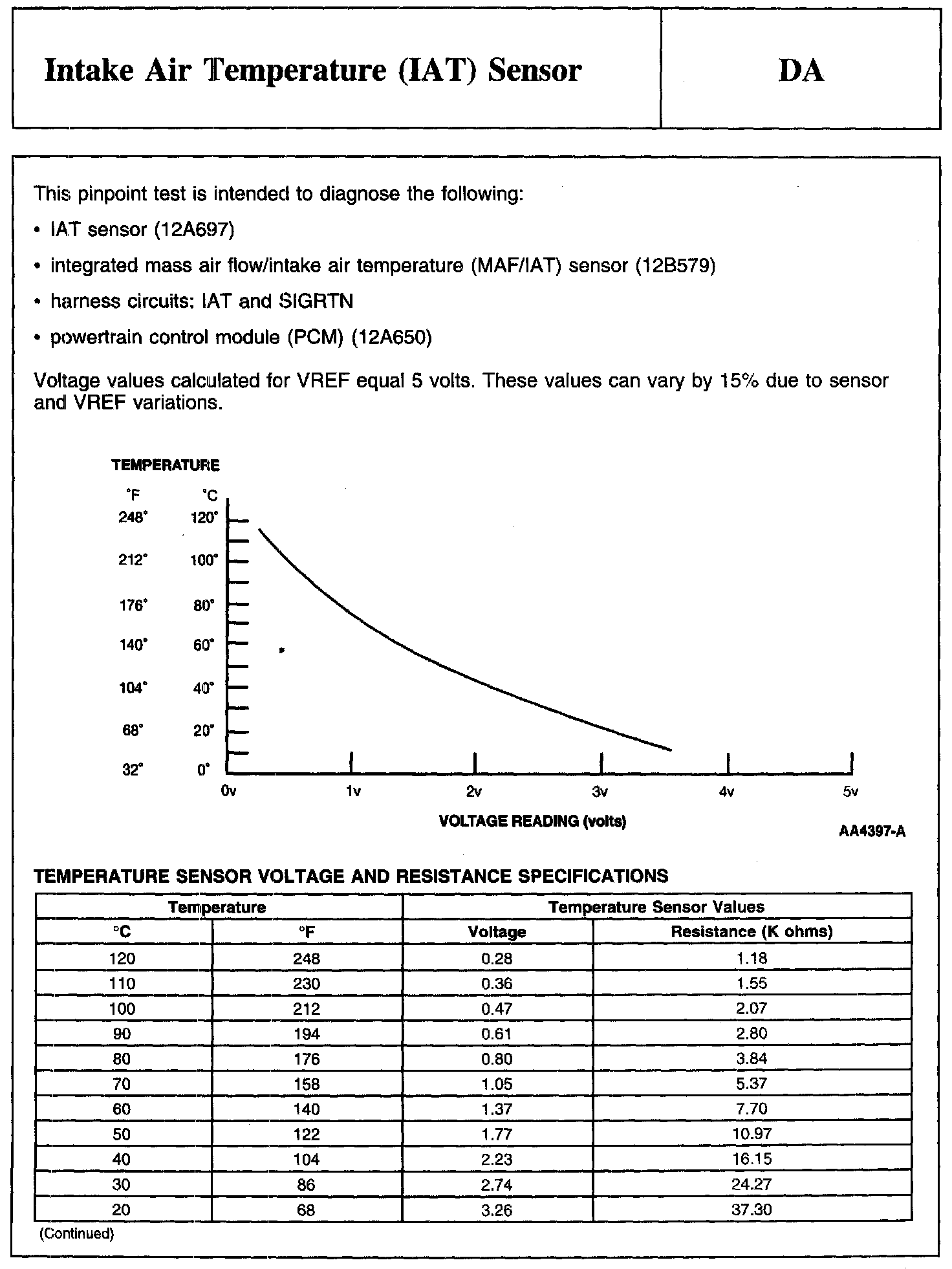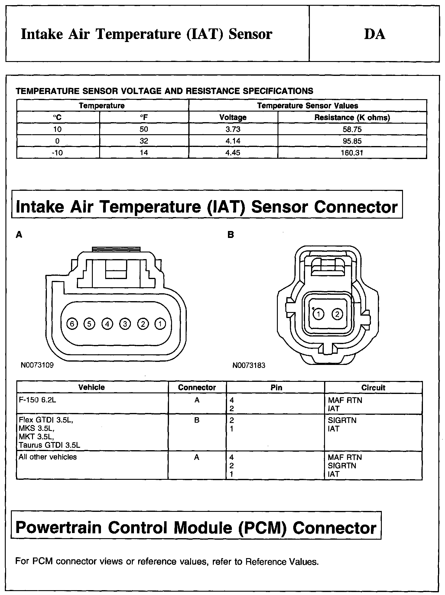 PINPOINT TEST DA: INTAKE AIR TEMPERATURE (IAT) SENSORTemperature Sensor Voltage And Resistance Specifications: