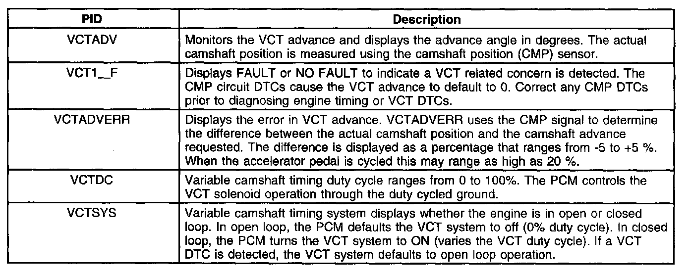 The PCM calculates and determines the desired camshaft position. It continually updates the VCT solenoid duty cycle until the desired position is achieved. A difference between the desired and actual camshaft position represents a position error in the PCM VCT control loop. The PCM disables the VCT and places the camshaft in a default position if a concern is detected. A related DTC is also set when the concern is detected.