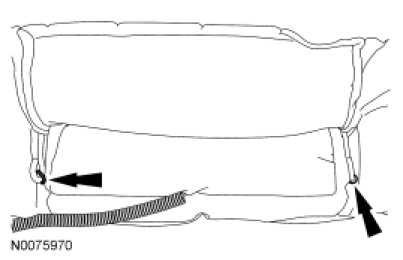 Release the seat backrest trim cover lower J-clip and partially invert the trim cover up the seat backrest to expose the 2 tensioning rods and hog rings.