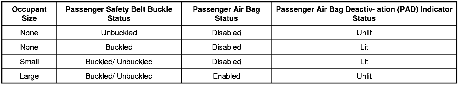 The following table indicates the passenger air bag status and the PAD indicator status based on the size of the front outboard passenger occupant.