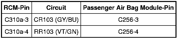 - Connect a fused jumper wire between passenger air bag module C256-3, circuit CR103 (GY/BU), harness side and C256-4, circuit RR103 (VT/GN), harness side.