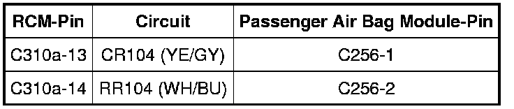 - Connect a fused jumper wire between passenger air bag module C256-1, circuit CR104 (YE/GY), harness side and C256-2, circuit RR104 (WH/BU), harness side.