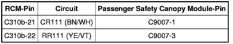 - Connect a fused jumper wire between passenger side air curtain C9007-1, circuit CR111 (BN/WH), harness side and C9007-3, circuit RR111 (YE/VT), harness side.