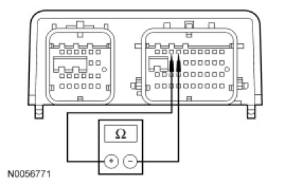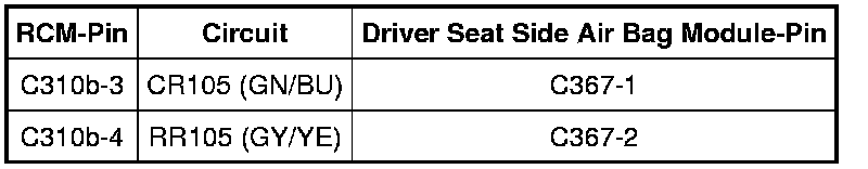 - Measure resistance between driver seat side air bag C367-1, circuit CR105 (GN/BU), harness side and C367-2, circuit RR105 (GY/YE), harness side.