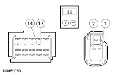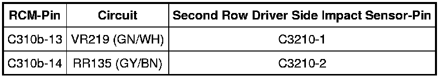 - Measure resistance between second row driver side impact sensor C3210-1, circuit VR219 (GN/WH), harness side and C3210-2, circuit RR135 (GY/BN), harness side.