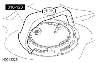 Install the Fuel Tank Sender Unit Wrench and remove the FP module lock ring.