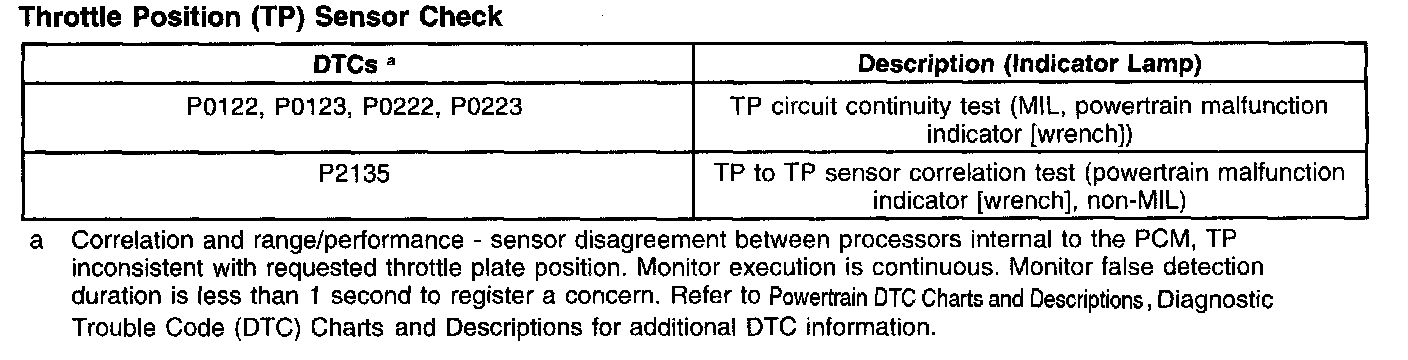 - There is one reference voltage and one signal return circuit between the PCM and the ETB. The reference voltage and the signal return circuits are shared with the reference voltage and signal return circuits used by the accelerator pedal position (APP) sensor. There are also two throttle position (TP) signal circuits for redundancy. The redundant TP signals are required for increased monitoring reasons. The first TP signal (TP1) has a negative slope (increasing angle, decreasing voltage) and the second signal (TP2) has a positive slope (increasing angle, increasing voltage). The TP2 signal reaches a limit of approximately 4.5 volts at approximately 45 degrees of throttle angle.