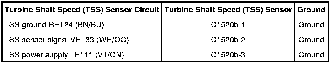 NOTE: Turbine Shaft Speed (TSS) codes may be a result of bad power and ground circuits shared between the Transmission Range (TR) sensor, Output Shaft Speed (OSS) sensor and TSS sensor.