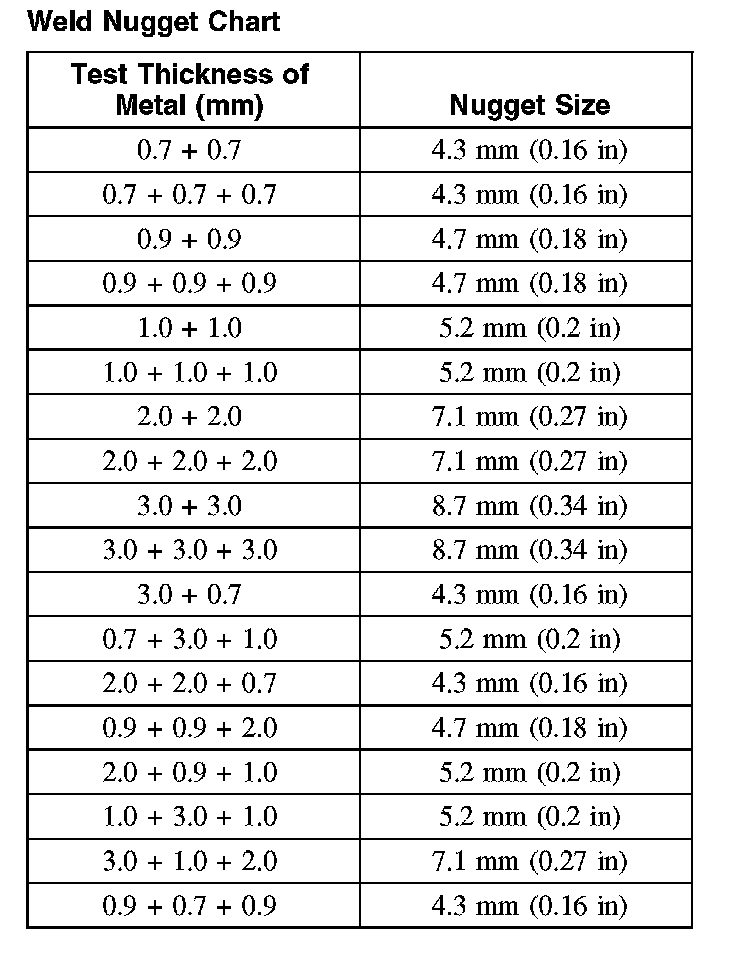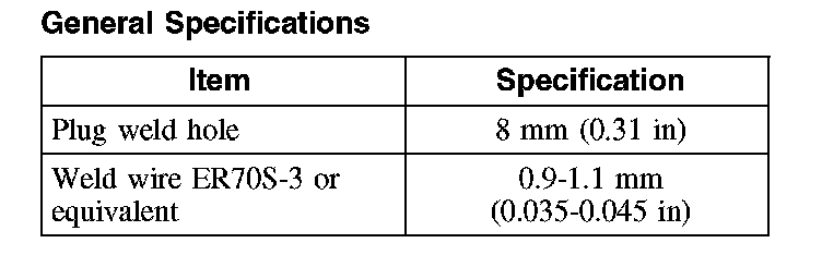 - Factory spot welds may be substituted with either STRW or MIG plug welds. Spot/plug welds should equal factory welds in both location and quantity. Do not place a new spot weld directly over an original weld location. Plug weld hole should equal 8 mm (0.31 in) diameter.