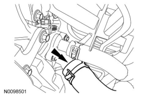 26. Detach the EPAS system wiring harness pin-type retainer from the subframe under the LH fender splash shield.