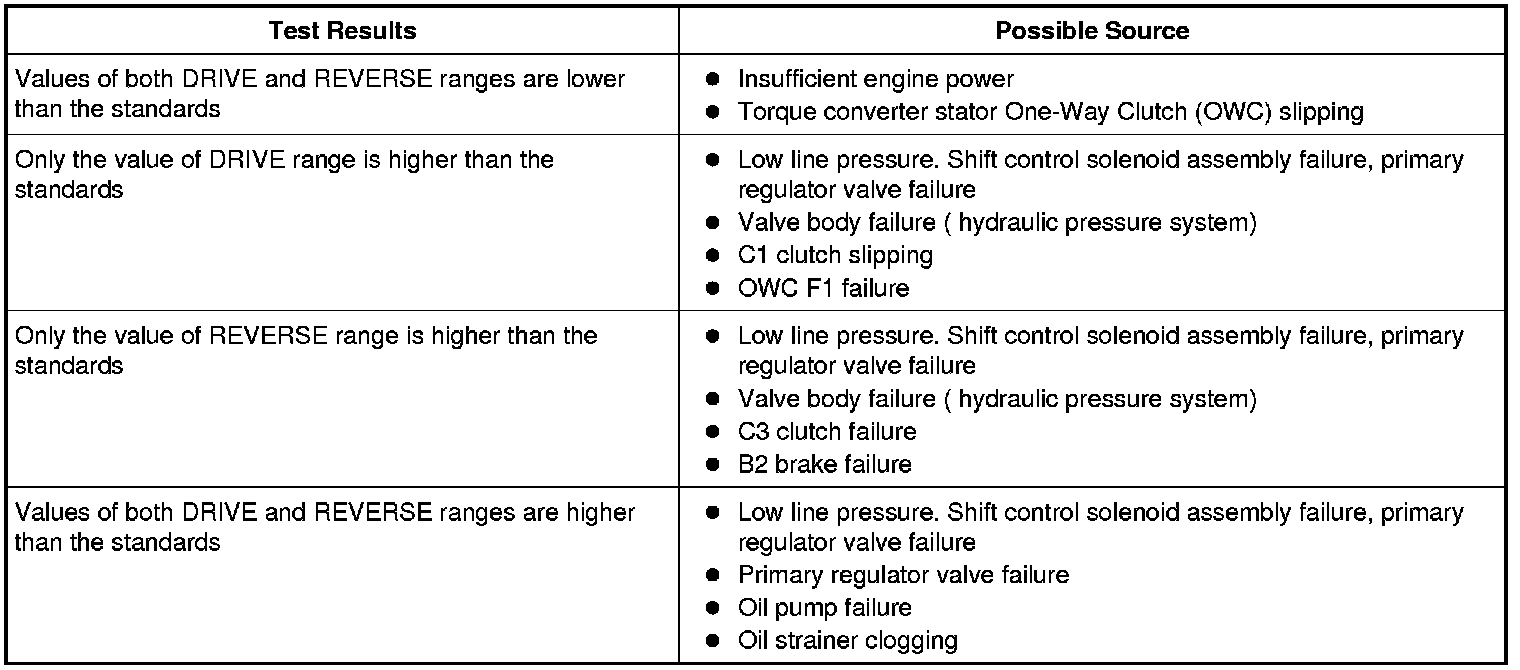 If stall speeds were too high, see the Stall Speed Chart. If stall speeds were too low, first check engine idle speed and tune up. If engine is OK, remove torque converter and check TCC for slippage.