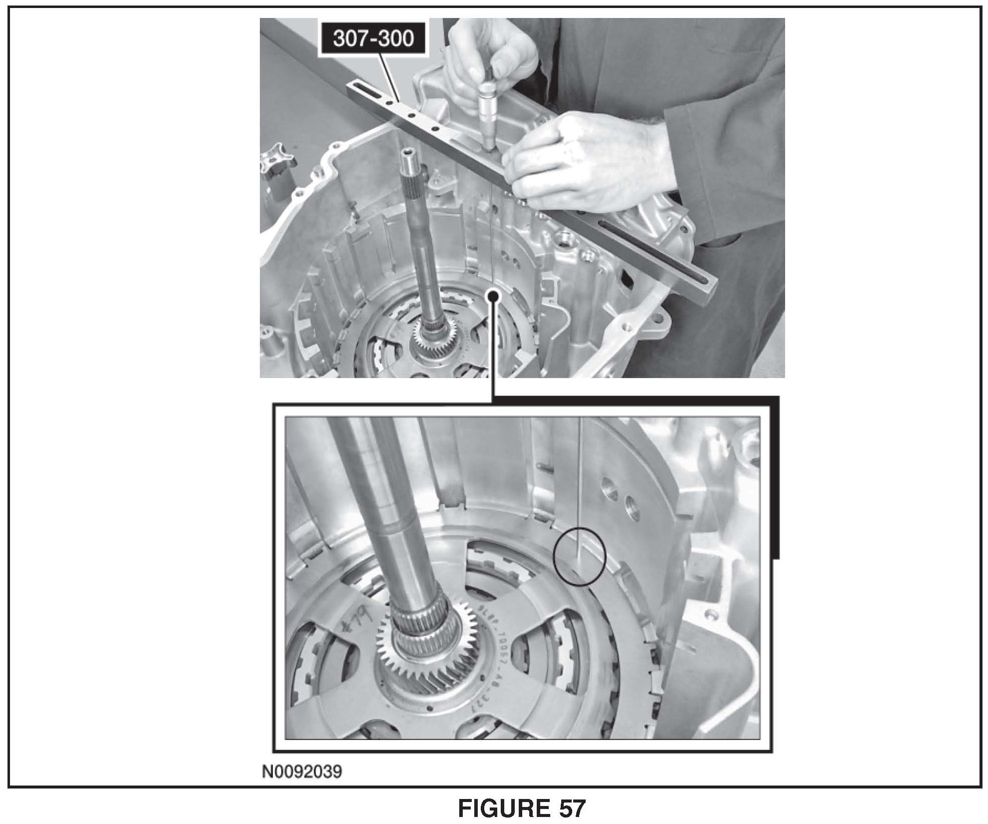 11. Using a suitable depth gauge, measure the distance from the top of Shim Selection Gauge # 307-300 to the transaxle case step above the intermediate (2, 6) clutch Record this as measurement B. See Figure 58.