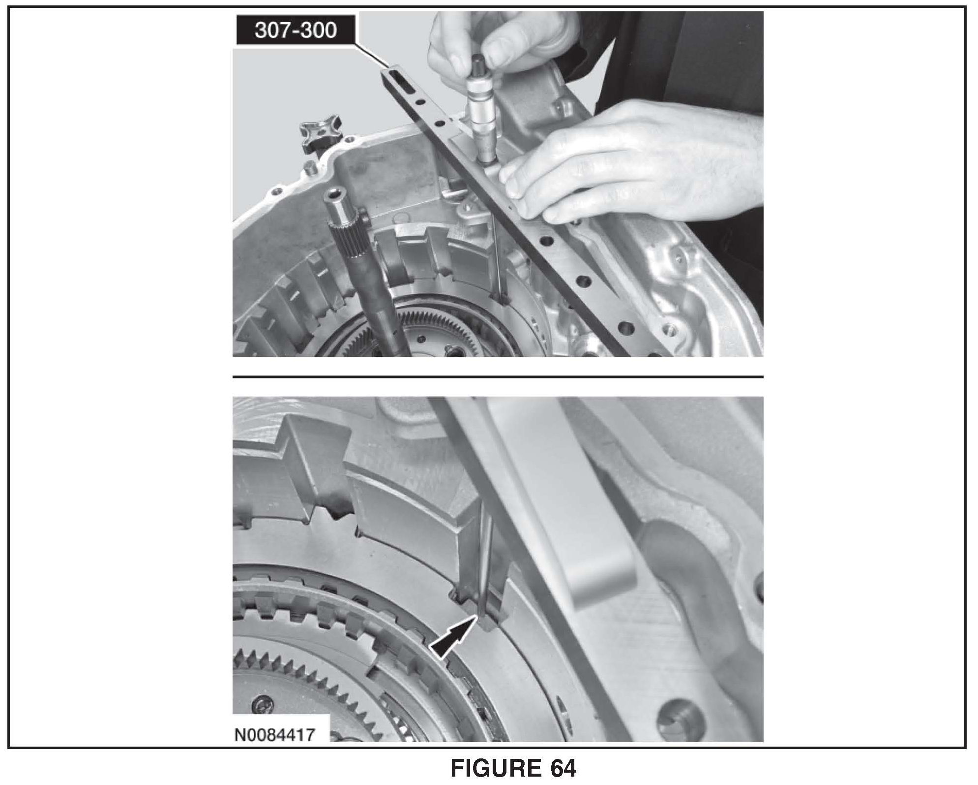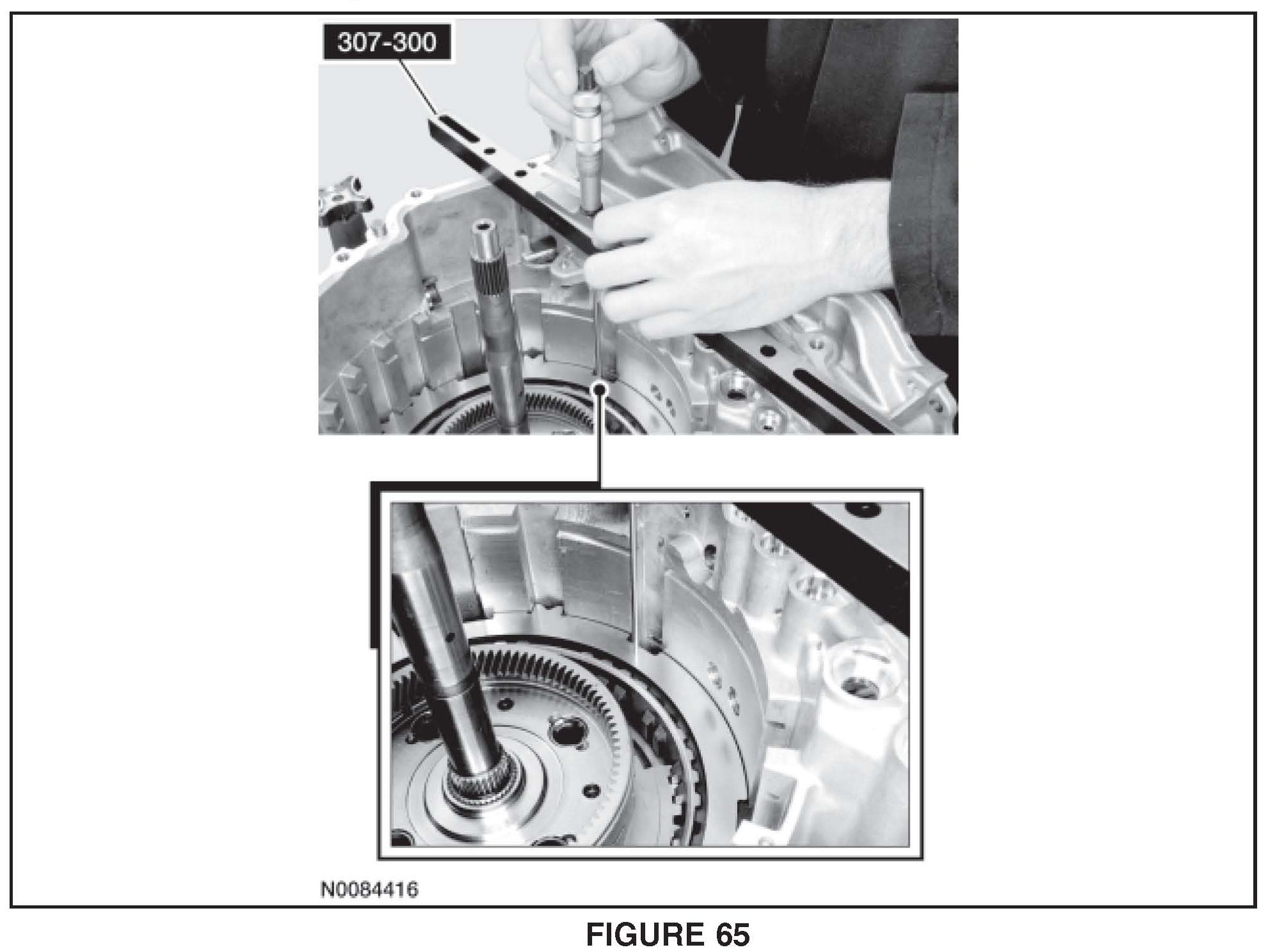 25. Using a suitable depth gauge measure the distance from the top of Shim Selection Gauge # 307300 to the top of the low/reverse clutch at 3 different points and average the 3 distances Record this as measurement E. See Figure 65.