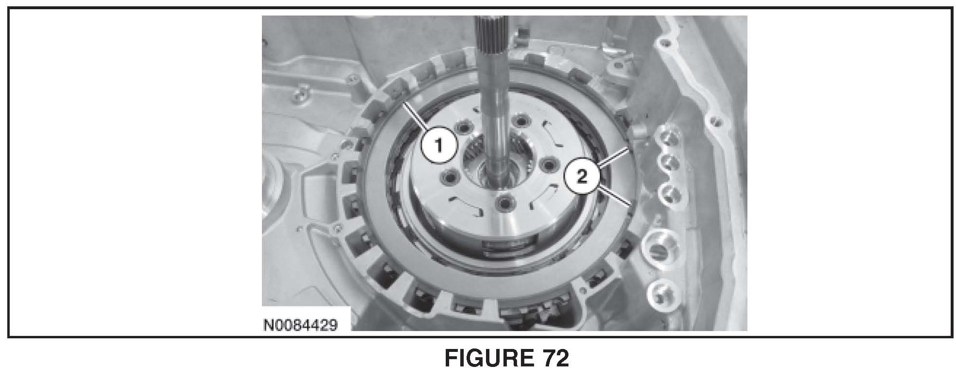 Install the forward (1, 2, 3, 4) clutch beveled snap ring with the flat side down with the gap facing the front of the transaxle. See Figure 72.