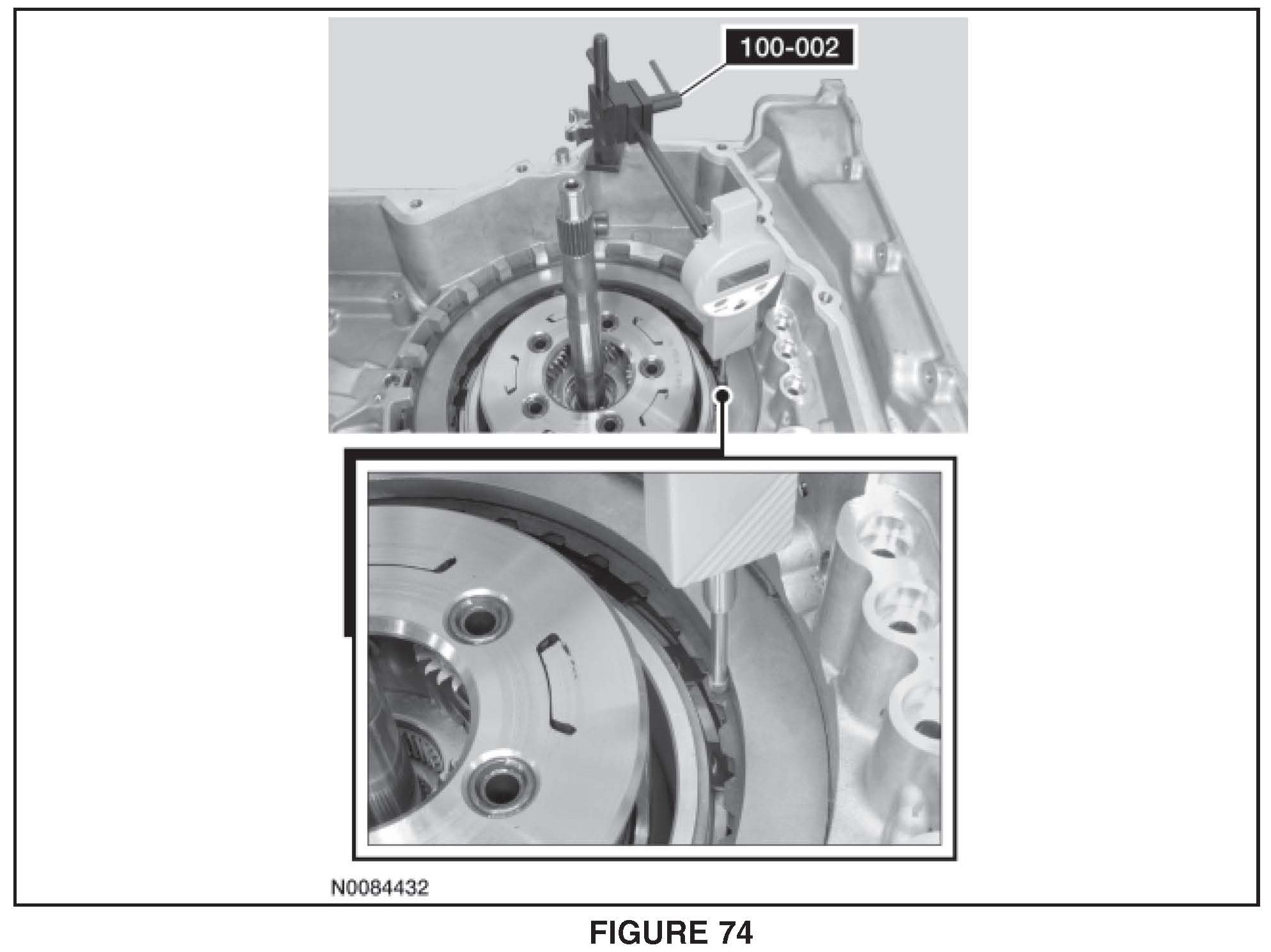 41. Install Dial Indicator Gauge with Holding Fixture # 100002 or a suitable dial indicator on the transaxle case and position the plunger on the top forward (1, 2, 3, 4) clutch friction plate. See Figure 74.