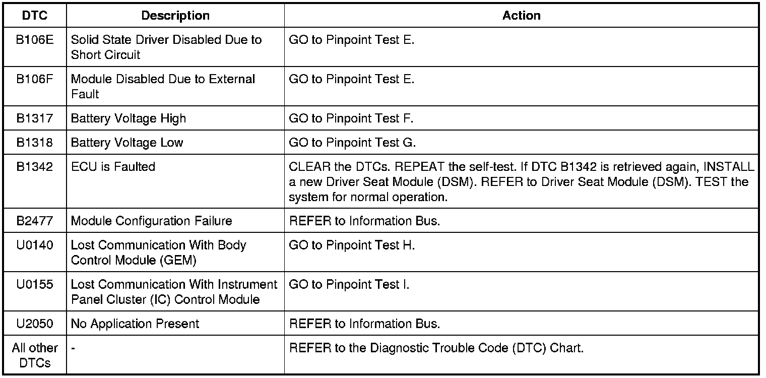 Driver Seat Module (DSM) DTC Chart