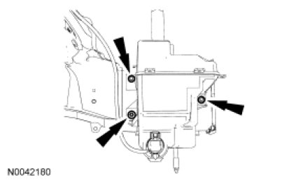 7. Remove the windshield washer reservoir fasteners and the windshield washer reservoir.