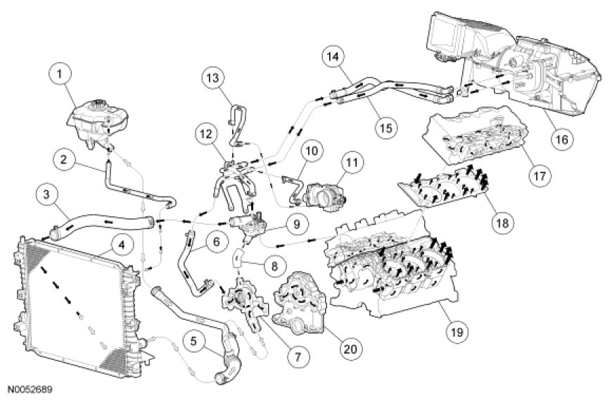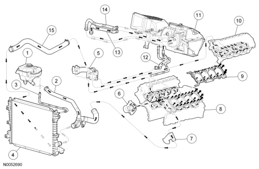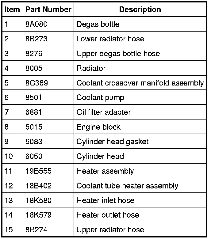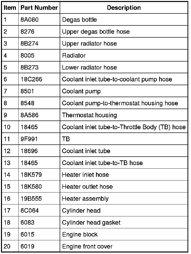 The 4.6L (3V) and 5.4L (4V) cooling system components include the:
