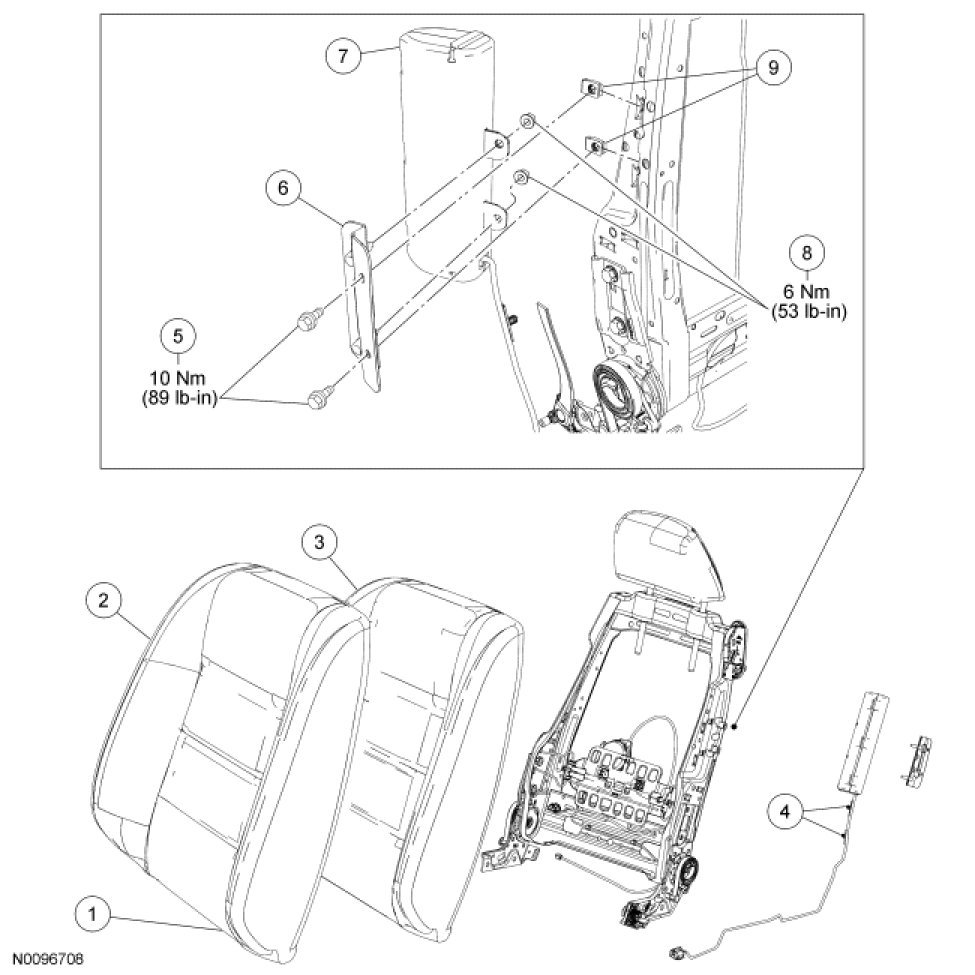 9. Install the front seat backrest. For additional information, refer to Seats.