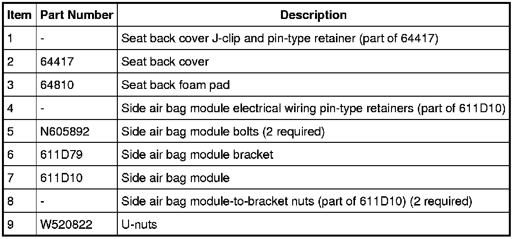 1. NOTE: When installing a new side air bag module after deployment, install a new side air bag module, bracket, module-to-bracket nuts, U-nuts-to-backrest frame and side air bag module bracket-to-seat backrest frame bolts.