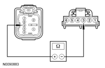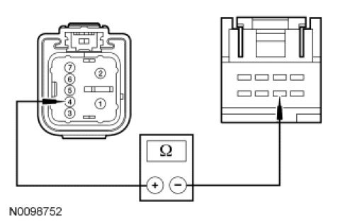 - Measure the resistance between RH front window motor C623-5, circuit CPW12 (GN/OG), harness side and RH front window control switch C604-3, circuit CPW12 (GN/OG), harness side.