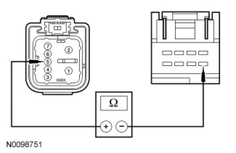 - Measure the resistance between RH front window motor C623-5, circuit CPW12 (GN/OG), harness side and LH front window control switch C504-5, circuit CPW12 (GN/OG), harness side.