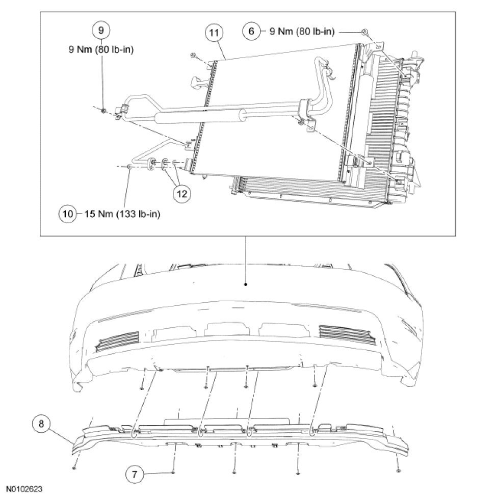 8. NOTE: The radiator must be positioned rearward to access the 2 upper condenser bolts.