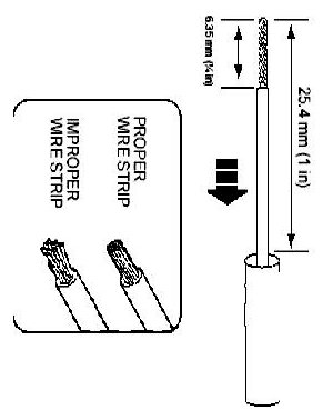 2. Strip 6.35mm (1/4 in) of insulation from each wire end, taking care not to nick or cut wire strands.