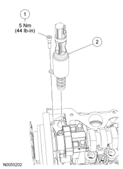 2. Remove the bolt and the Variable Camshaft Timing (VCT) oil control solenoid.