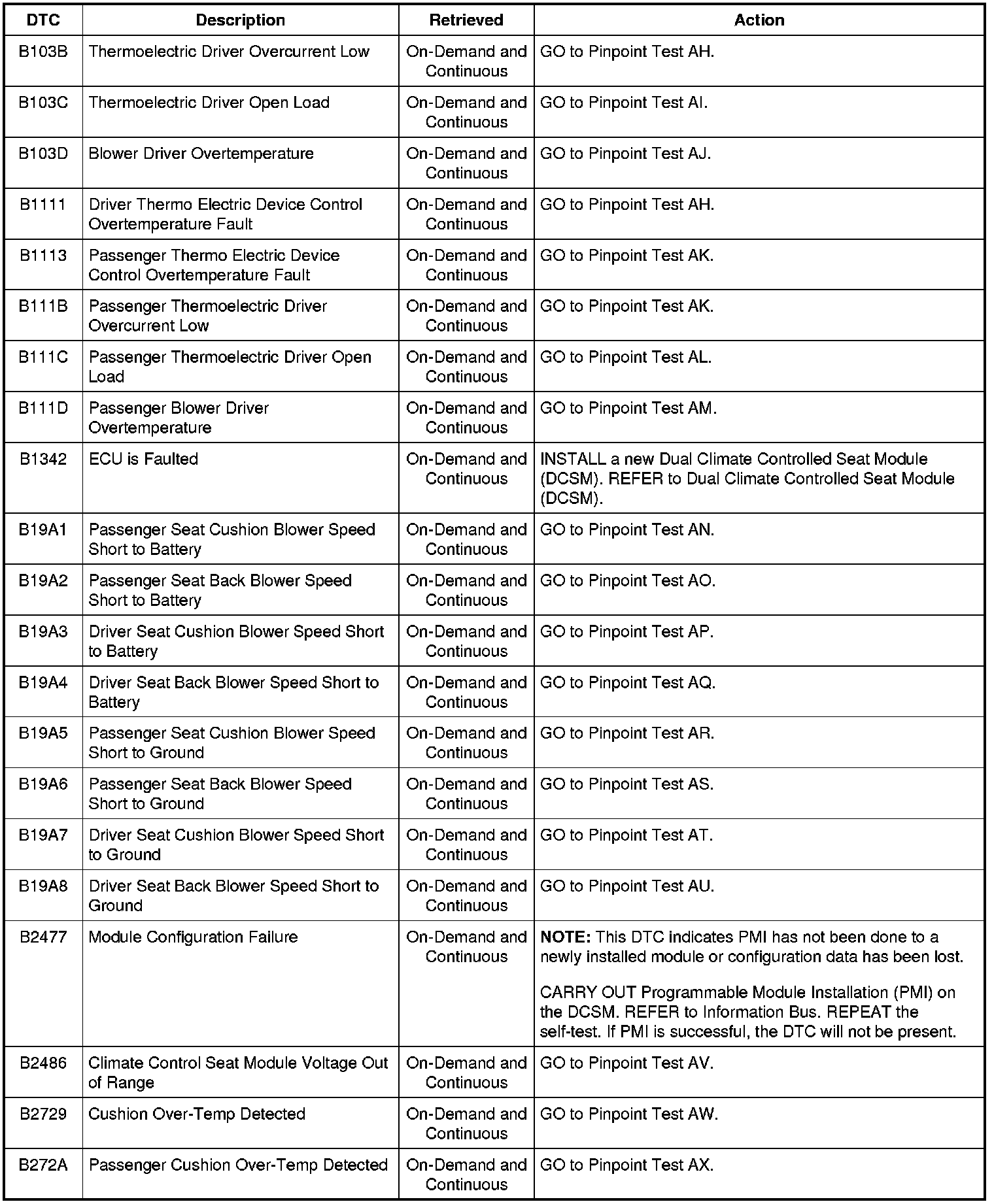 Dual Climate Controlled Seat Module (DCSM) DTC Chart