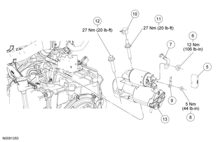 10. Remove the starter motor stud bolt, bolt and the starter motor.