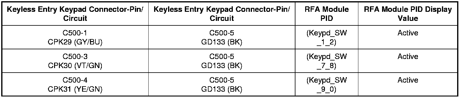 - Press each keyless entry keypad button while observing the RFA module PIDs (Keypd_SW_1_2), (Keypd_SW_3_4), (Keypd_SW_5_6), (Keypd_SW_7_8) and (Keypd_SW_9_0).