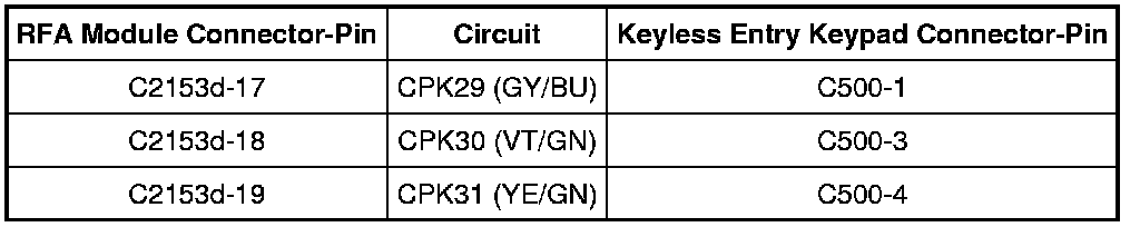 - For early build vehicles, measure the resistance between the RFA module, harness side and the keyless entry keypad, harness side as follows: