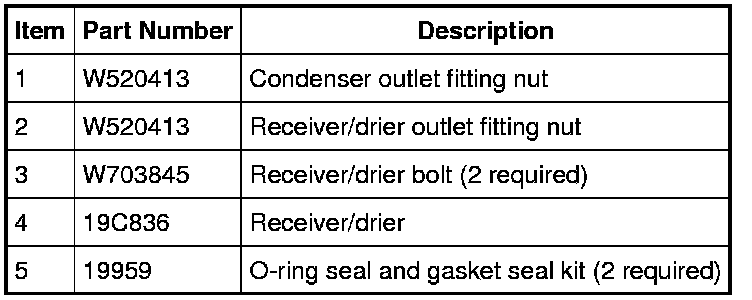NOTE: Installation of a new receiver/drier is not required when repairing the A/C system, except when there is physical evidence of contamination from a failed A/C compressor or damage to the receiver/drier. Damage to the receiver/drier includes leaks in the receiver/drier, physical damage to the receiver/drier shell or desiccant, or moisture contamination. Moisture contamination results only from a complete loss of refrigerant and equalization of the refrigerant system pressure with atmospheric pressure for a period longer than one hour. If even a slight amount of positive refrigerant pressure is present in the system before repairs are carried out, the receiver/drier should not be replaced.