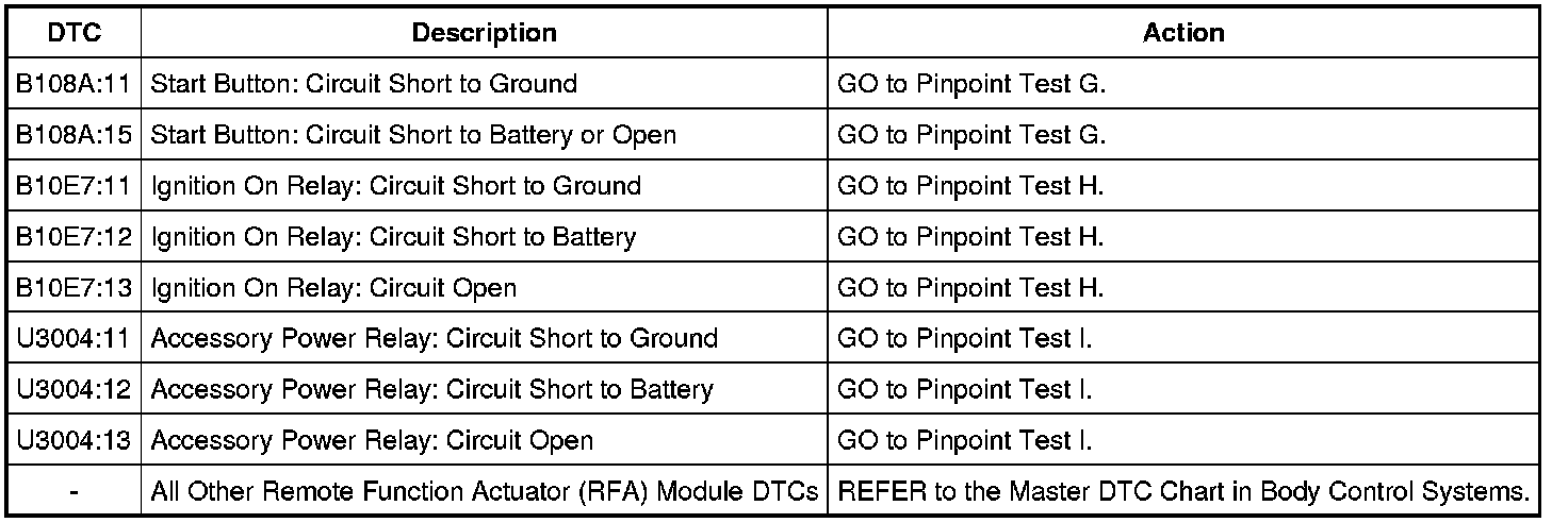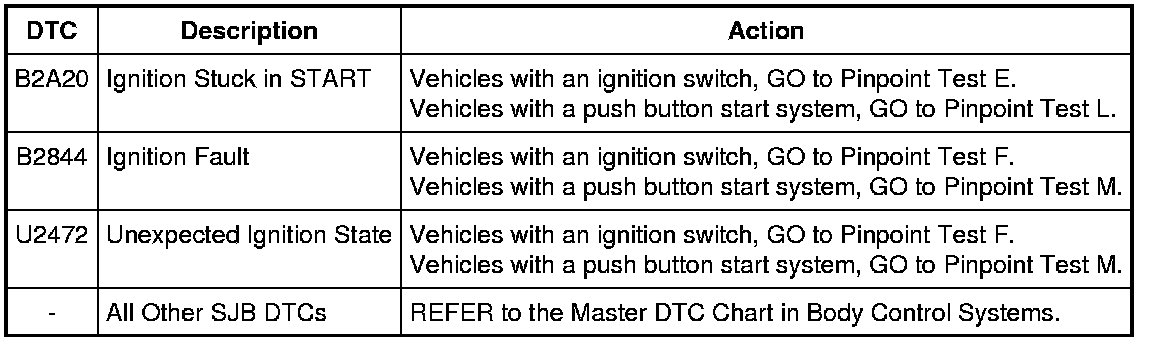 NOTE: Any push button start system fault will result in DTCs being stored in both the Remote Function Actuator (RFA) module and the Smart Junction Box (SJB). If the vehicle is equipped with a push button start system, correct all RFA module DTCs prior to diagnosing the SJB DTCs listed below.