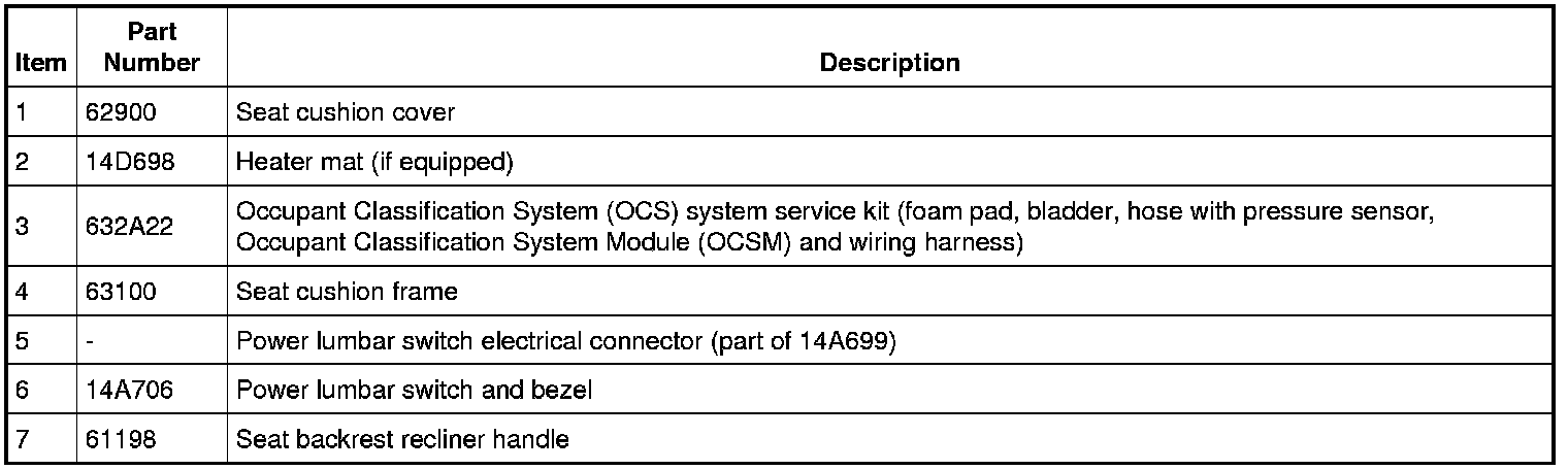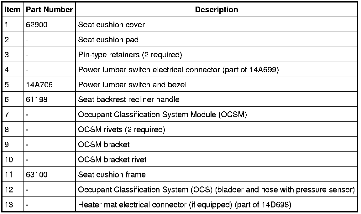 WARNING: Occupant classification system(OCS) parts are calibrated as an assembly and must only be replaced in the configuration they are sold. Never separate parts of an assembly. Failure to follow this instruction may result in incorrect operation of the OCS and increases the risk of serious personal injury or death in a crash.