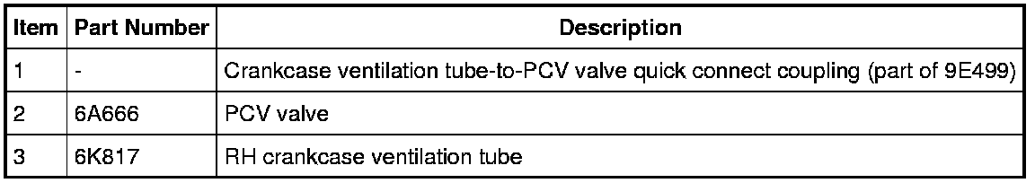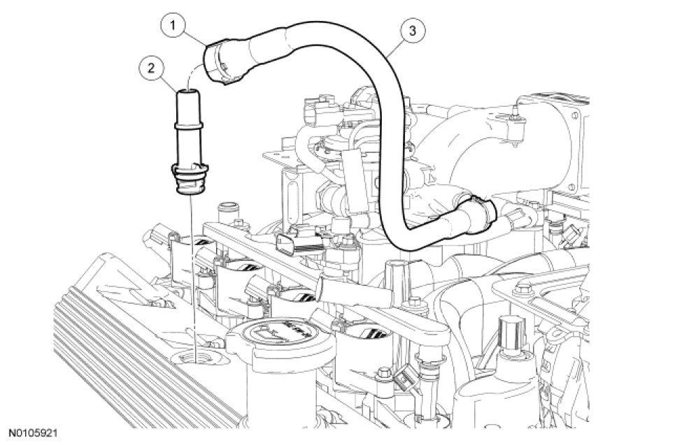 1. Disconnect the crankcase ventilation tube-to-PCV valve quick connect coupling and position the tube aside. For additional information, refer to Fuel System - General Information Service and Repair.