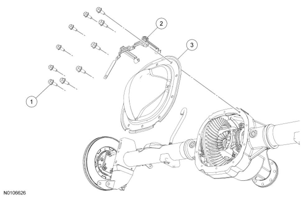 1. Remove the 10 differential housing cover bolts and drain the lubricant from the differential housing.