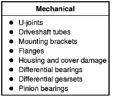 Certain axle and driveline symptoms are also common to the engine, transmission, wheel bearings, tires and other parts of the vehicle. For this reason, be sure that the cause of the trouble is in the driveline before disassembling, adjusting or repairing the driveline. Refer to Noise, Vibration and Harshness Symptom Related Diagnostic Procedures.