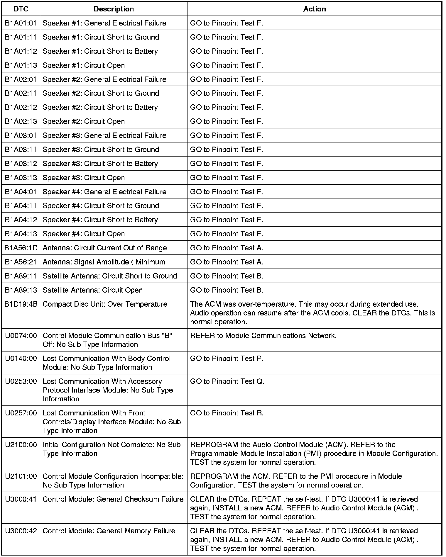 Audio Control Module (ACM) DTC Chart