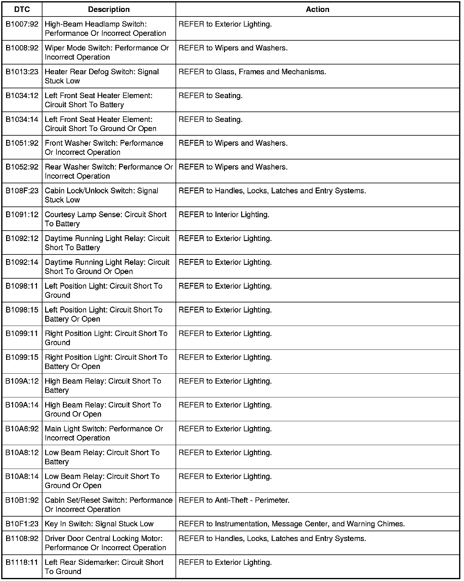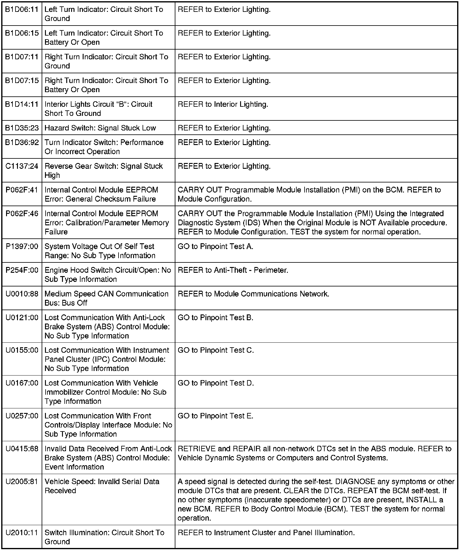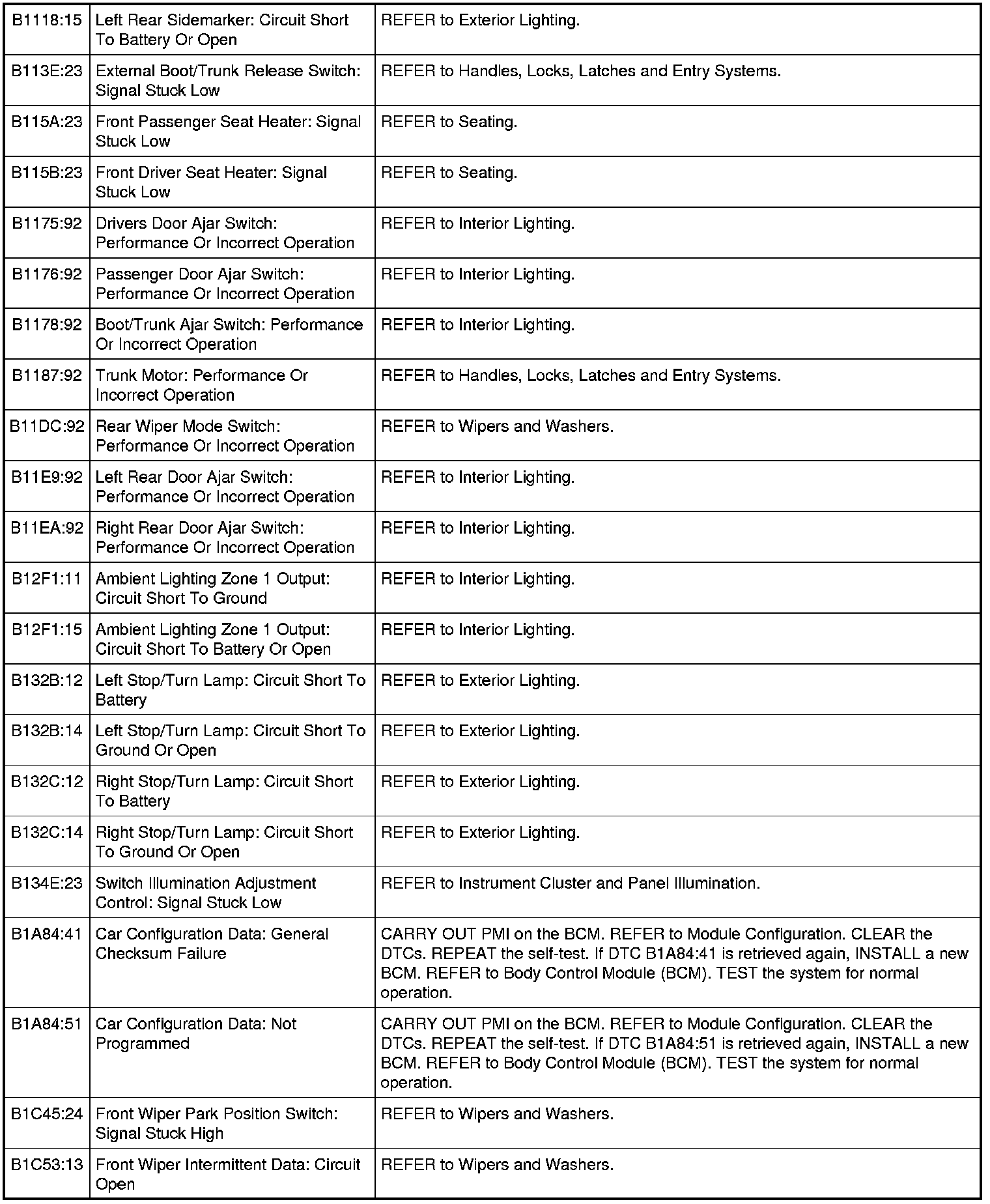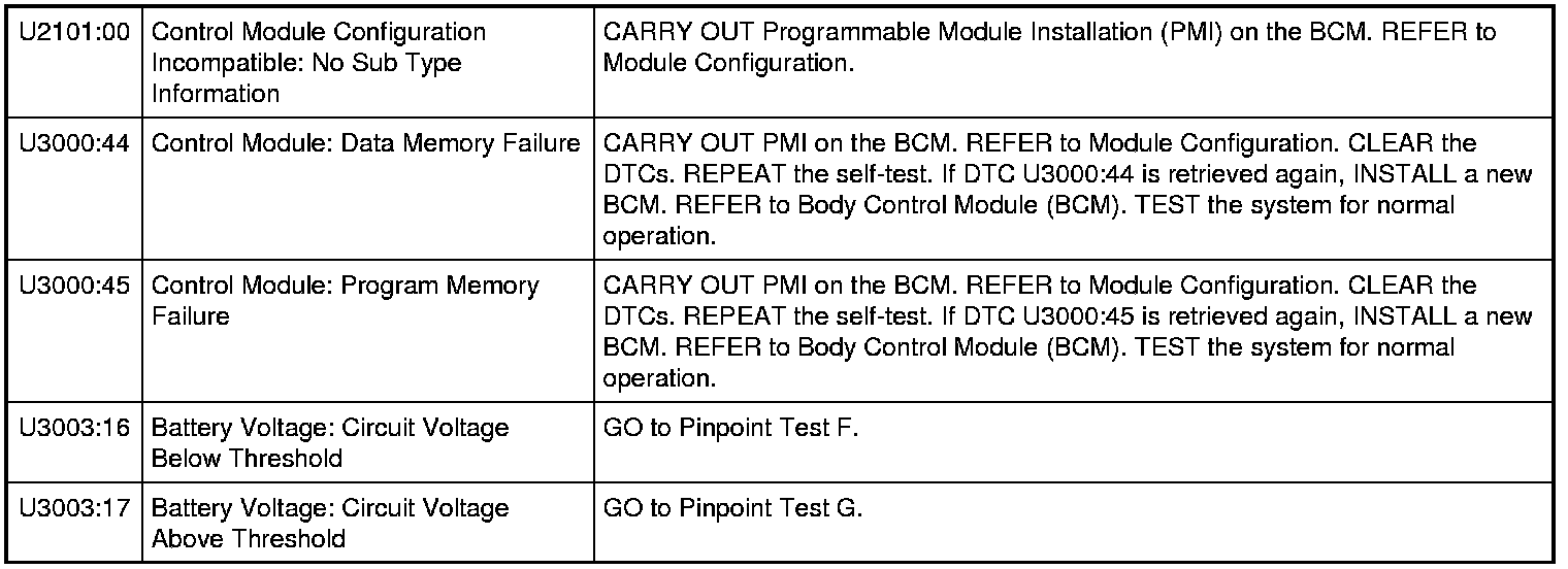 Body Control Module (BCM) DTC Chart