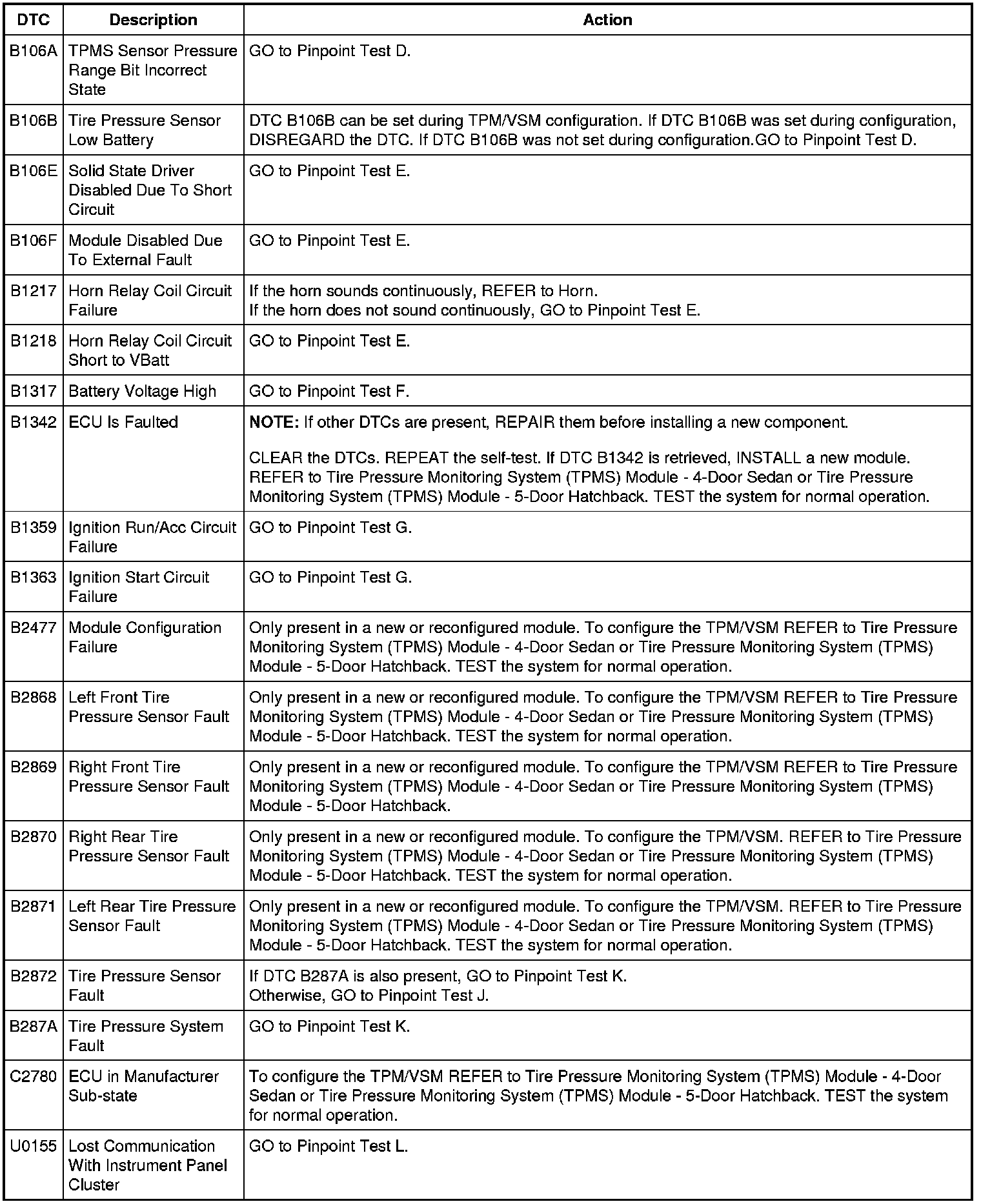 Tire Pressure Monitor (TPM)/Vehicle Security Module (VSM) DTC Chart