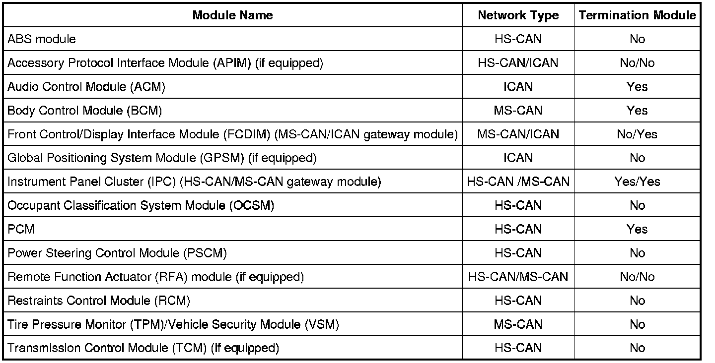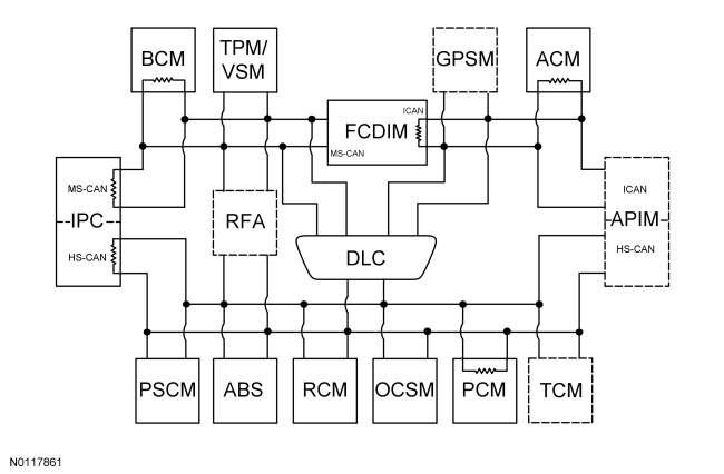 The IPC is the gateway module, translating HS-CAN to MS-CAN and vice versa. The FCDIM is the gateway module, translating MS-CAN to ICAN and vice versa, allowing a message to be distributed throughout the three networks. The IPC and the FCDIM are the only modules on this vehicle that have this ability.