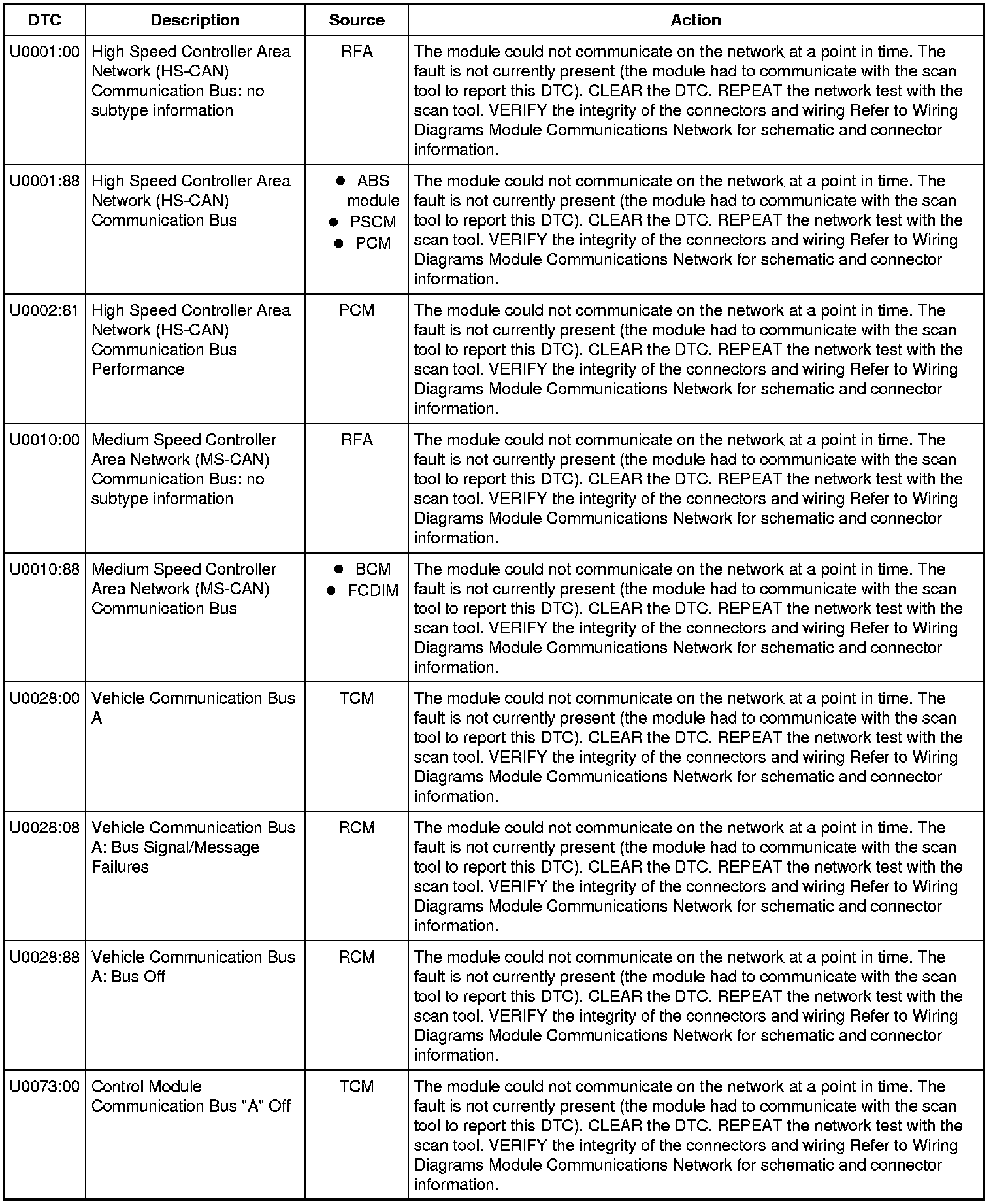 NOTE: Network DTCs (U-codes) are often a result of intermittent concerns such as damaged wiring or low battery voltage occurrences. Additionally, repair procedures such as module reprogramming often set network DTCs. Replacing a module to resolve a network DTC is unlikely to correct the concern. To prevent repeat network DTC concerns, inspect all network wiring, especially connectors. Test the vehicle battery, refer to Battery, Mounting and Cables Testing and Inspection.