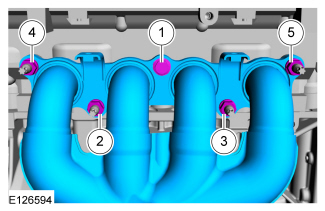 NOTICE: Failure to tighten the catalytic converter manifold fasteners in 20 Nm increments until reaching final torque of 55 Nm will cause the converter to develop an exhaust leak.