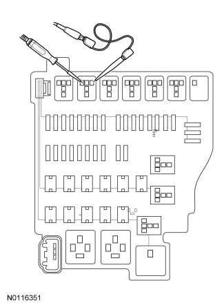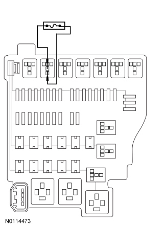 - Connect a 12-volt test light between BJB starter relay cavity 1, circuit CDC54 (WH/GN) and BJB starter relay cavity 2, circuit CDC12 (YE), then press the brake or clutch pedal and press the start/start switch.