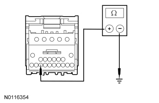 - Measure the resistance between RFA module C3503B-21, circuit CCA29 (GN/BU), harness side and ground.